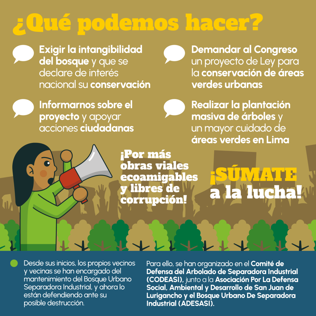 El Bosque Urbano Separadora Industrial no solo es un pulmón verde para los habitantes de Lima, sino también un refugio de biodiversidad y un espacio recreativo fundamental. La construcción del AVP podría duplicar la contaminación del aire en la ciudad, generar desalojo de familias y transformar esta zona en una de las más afectadas por las «islas de calor», producto del uso excesivo de cemento y asfalto.